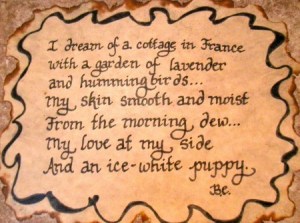 That little plague has much truth to it now; I have my love at my side, I have not one, but two “ice-white puppies,” and I live in a cottage of sorts with two large bushes of lavender near my front door.  The France thing, well, I’m still working on that.